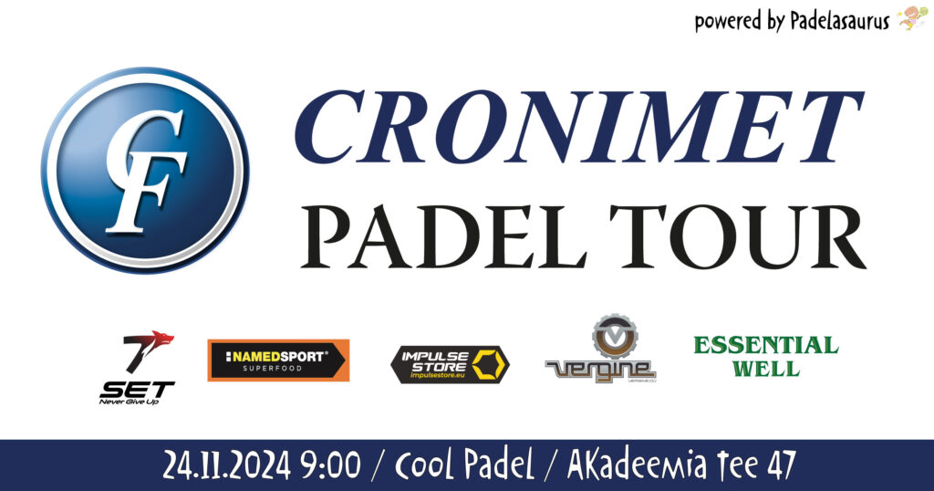 We invite you (with your padel partner) to register for the sixth stage of Cronimet Padel Tour. The event will take place on 24.11.2024 from 9:00 till 14:00, at Cool Padel (Akadeemia tee 47).